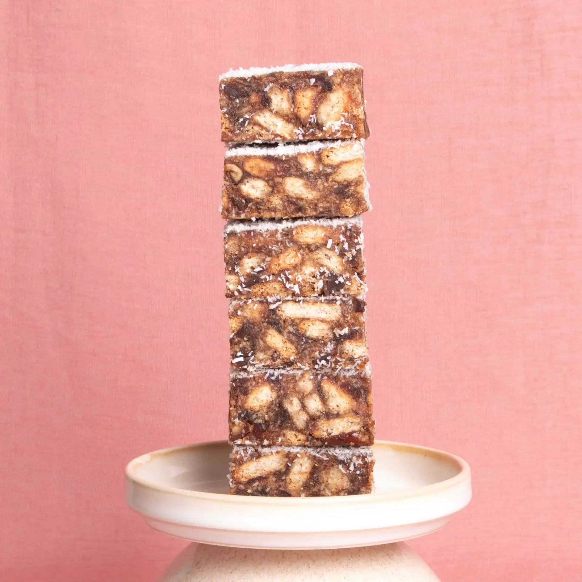 Dadel, (vegan) volkoren biscuits, plantaardige boter, bruine basterdsuiker, kokosrasp